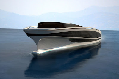 the boat is contained in a triangular hull measuring 58m x 38m. there is no superstructure. the initial idea of this hull was confirmed by the ramform hull which they discovered, redesigned and adapted to fit the concept of the wheel house that emerges from the silhouette of the ship. the interior of the yacht is fitted out with water resistant buffalo leather using the calpinage technique. the yacht which took years in the making has been tested in gotebourg, sweden, in a specialised tank testing facility, to see how it would perform in big seas. the outcome is that, in full swell, the bow moves a tiny bit and the stern stays completely still. anchored, the boat creates a totally flat surface behind it, like an olympic-size pool where you can swim in total peace. on the bow, there’s a seawater pool 25 metres long that follows the curve of the bow. the environmental and ecological advantages are a strong point of the boat WHY.different sources of energy are managed by a central computer. the yacht is powered using a diesel electric engine. a surface of the photovolatic panels which measure approximately 900 square meters provide the solar electricity generated which covers part of what is needed to subsist the boat.